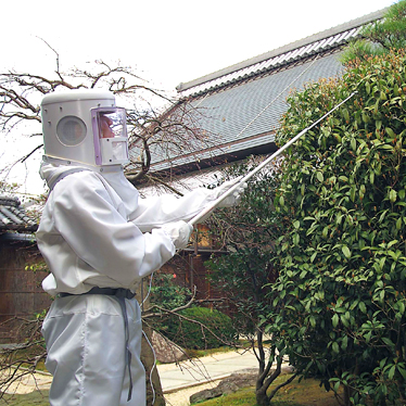 防護服、専用資器材などを使用してハチの巣を除去、戻りバチ対策にトラップも設置します。